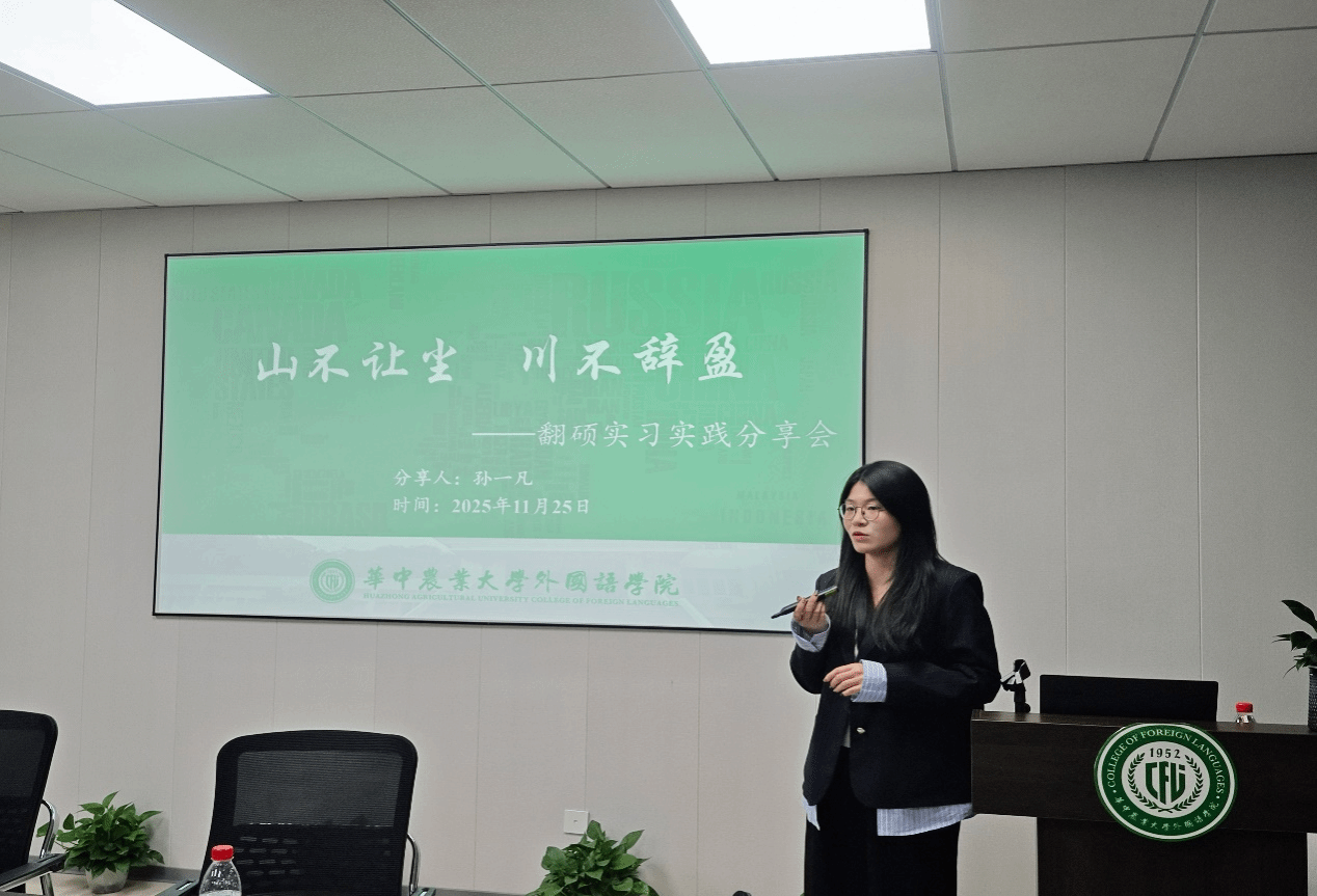 11月25日,必赢242net官网成功举办翻译硕士(MTI)实习实践专题分享会,邀请2024级翻硕研究生孙一凡同学,从学业竞赛、科研探索与专业实践三个方面,为师弟师妹们全面呈现翻硕学习的成长路径与实践收获。本次分享会内容充实、案例丰富、指导性强,为在场同学提供了宝贵的学习借鉴。