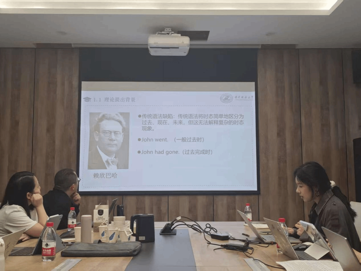 第二部分由华中科技大学研究生甘丹彤、李娟鸿两位同学汇报The Tense of Verbs(Reichenbach 1947),重点阐释“参照点”概念的引入及其在时态分析中的价值。徐贝贝评析了该理论的自洽性与创新点,强调要“文章之外看文章”,注重理论的发展趋势与本土化转换;徐毅发建议可从副词角度切入,探索文章所述理论在汉语中的适用路径。