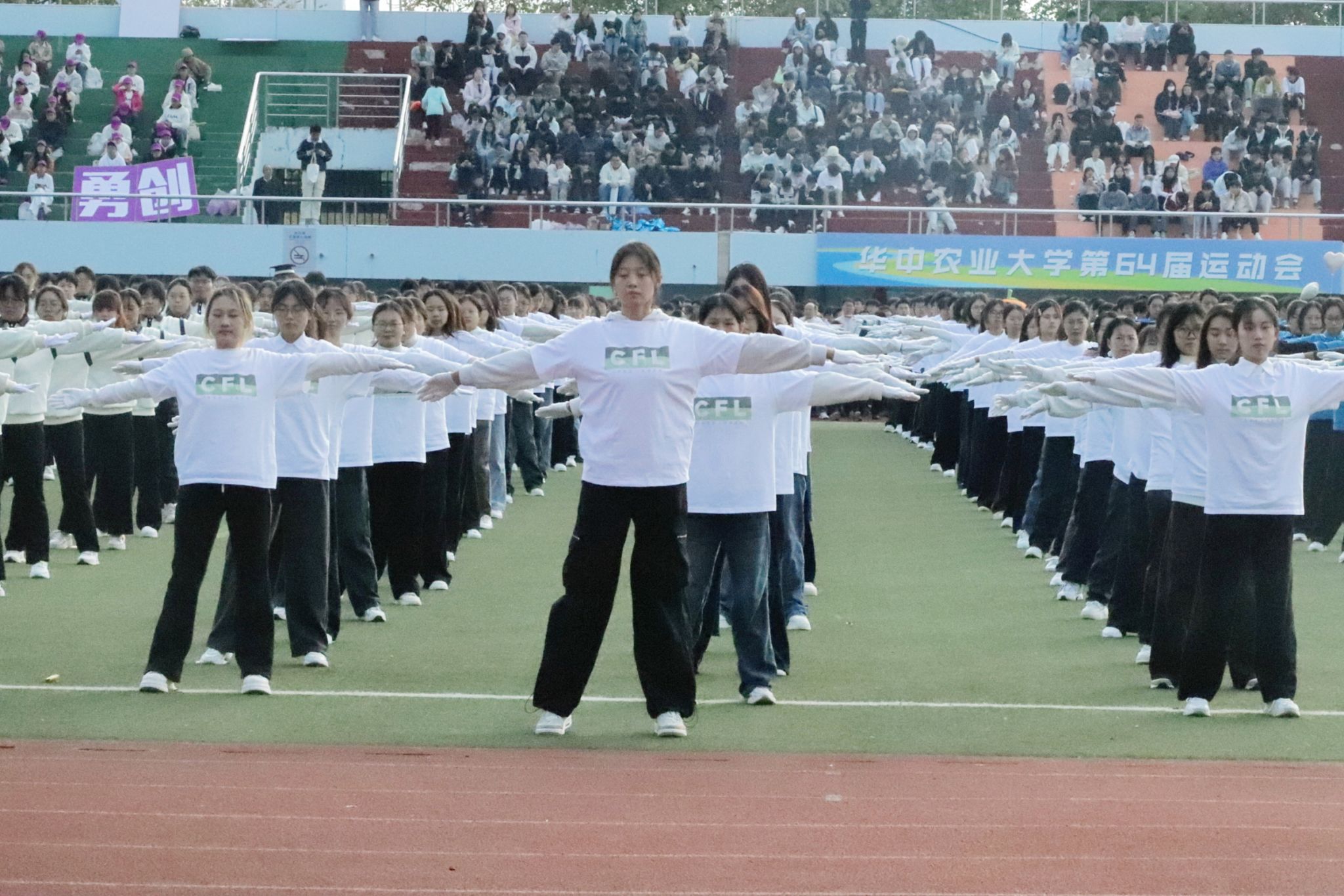 韵律操表演环节中,全校师生共同跃动,汇成一片活力海洋。外院师生动作标准,笑容自信,表现极具感染力。这一刻,语言的细腻与运动的活力完美交融。