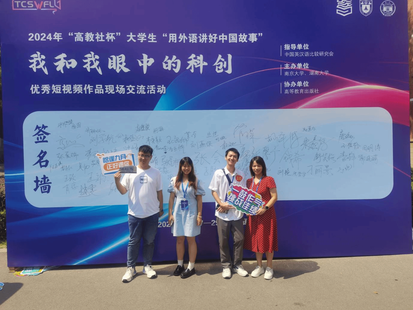 团队作品从全国5053件参赛作品中突围,成为72件线下国赛作品之一,最终斩获全国一等奖,不仅创我校在该赛事中的历史优异成绩,更直接验证了学校“一感四力”导向下公共外语教育改革“外语+文化+学术”融合路径的有效性,为学校一流拔尖创新人才培养提供了成功范例。